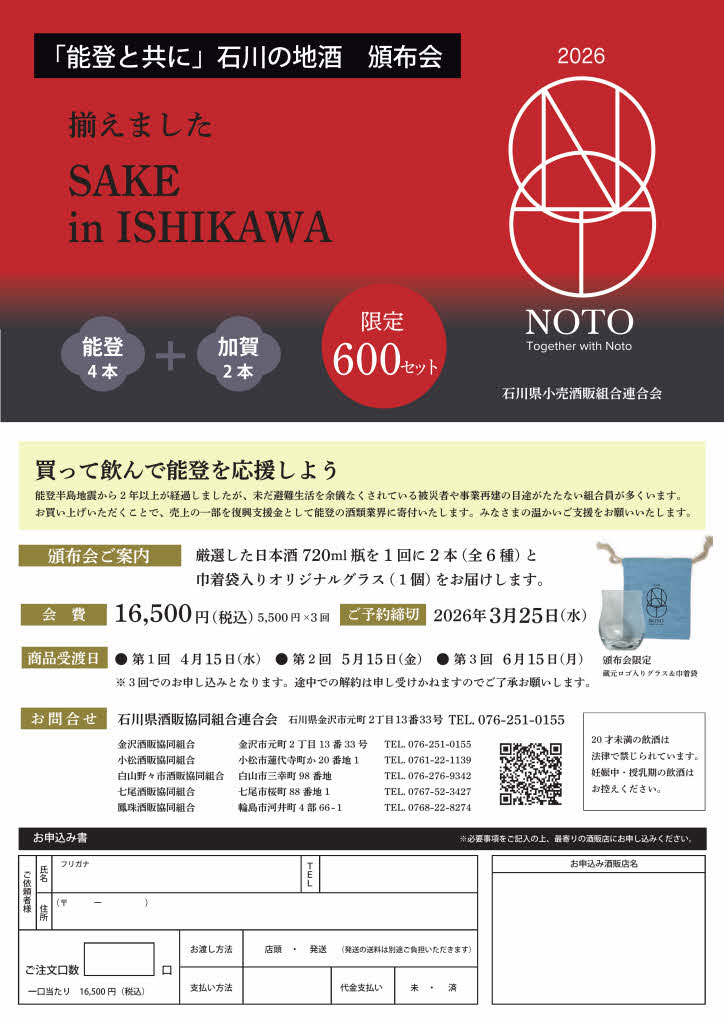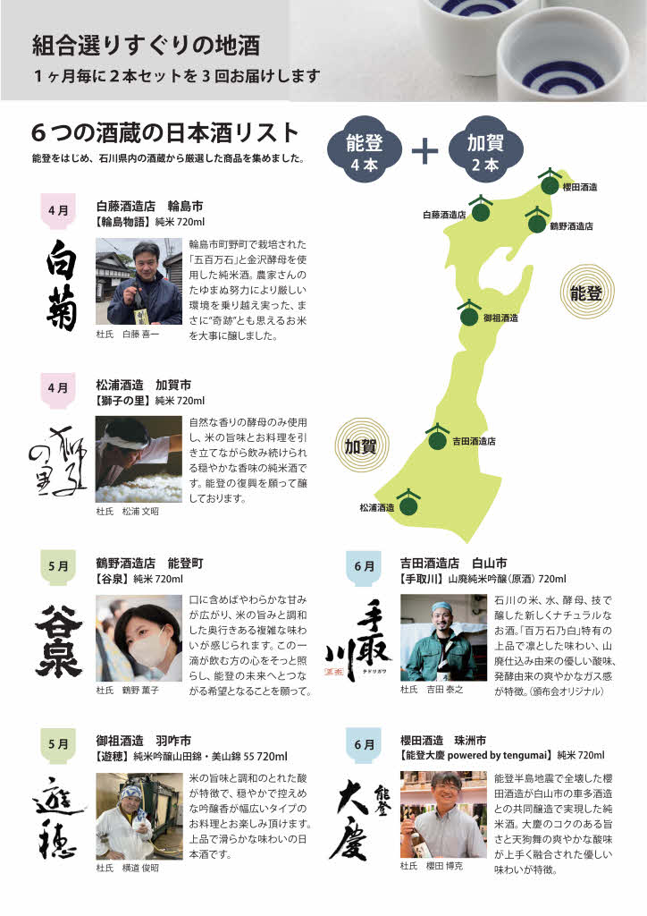 今回、改修工事を一部終え昨年の3月より製造開始している白藤酒造店(輪島市)、全壊から今春着工を目指す櫻田酒造(珠洲市)、金沢市以南の蔵元から支援を受け共同醸造している鶴野酒造店(能登町)、御祖酒造(羽咋市)、吉田酒造店(白山市)、松浦酒造(加賀市)の蔵元6社に協力いただき頒布会の実現に漕ぎつけることができました。