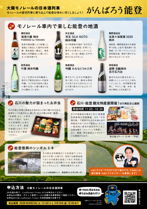 2025年9月20日に運行された万博記念公園駅(大阪モノレール・吹田市)発着、「がんばろう能登 日本酒列車」が志賀町観光協会【公式】サイトで取り上げられました。