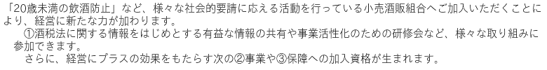 また、組合加入についてのご相談、ご質問につきましても、お気軽に小売酒販組合までお問い合わせください。